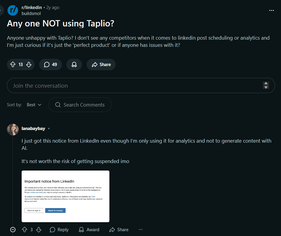 LinkedIn Account Risk: Several users have reported that using Taplio triggered warning messages from LinkedIn, leading to account restrictions or suspension.