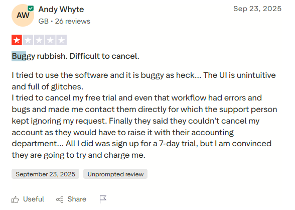 Hard to Cancel and Billing Friction: Users report trouble canceling trials, confusing subscription flows, and unexpected charges.