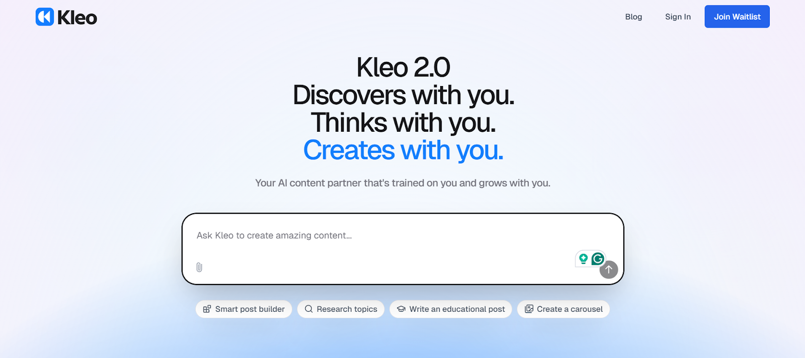 Kleo positions itself as an AI content partner rather than a simple writing tool. It works through chat to help you think, research, and collaboratively build posts. The focus is on moving from idea to post quickly, without losing clarity or intent.