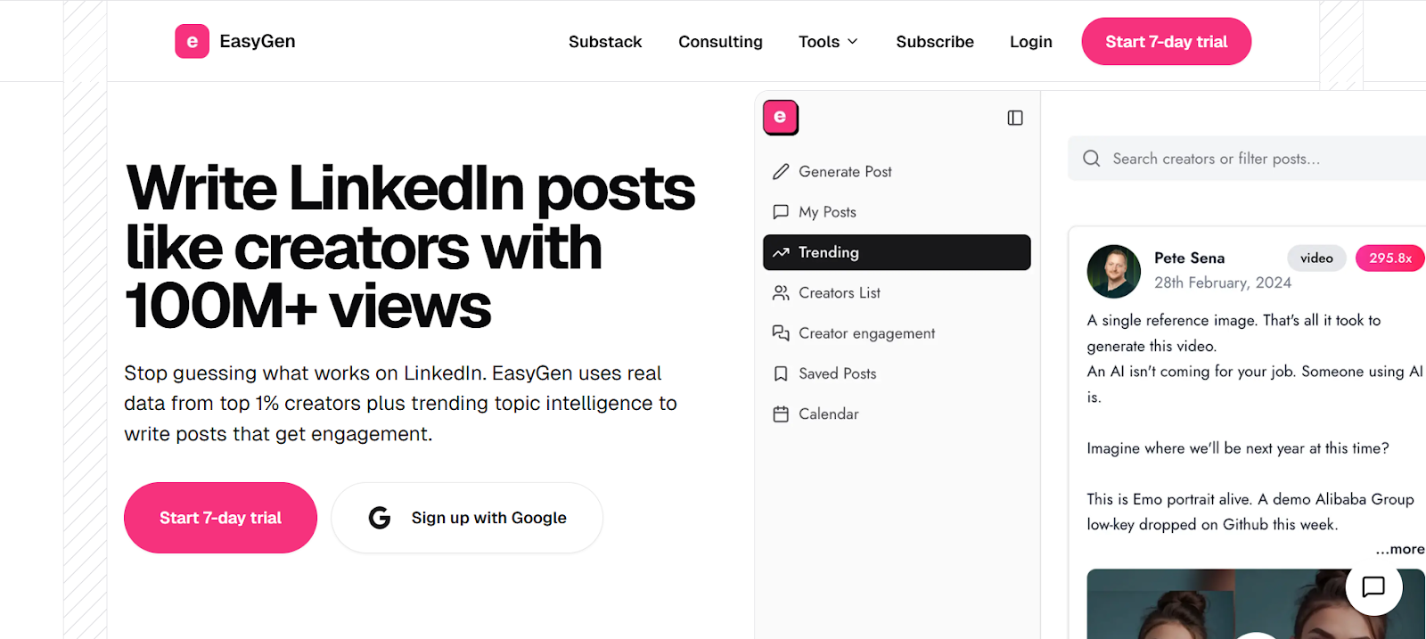 It helps with topic discovery, post structuring, and planning, all in one place. By combining creator insights, trending topics, and voice customization, EasyGen makes it easier to write posts that don’t sound generic, while staying grounded in what drives engagement on LinkedIn.