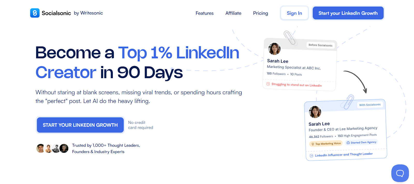 The tool analyzes what’s gaining traction in your industry and uses that insight to suggest content ideas and posts aligned with your goals. With built-in scheduling and performance tracking, Socialsonic focuses on consistency and visibility, making it easier to turn regular posting into a habit rather than a chore.